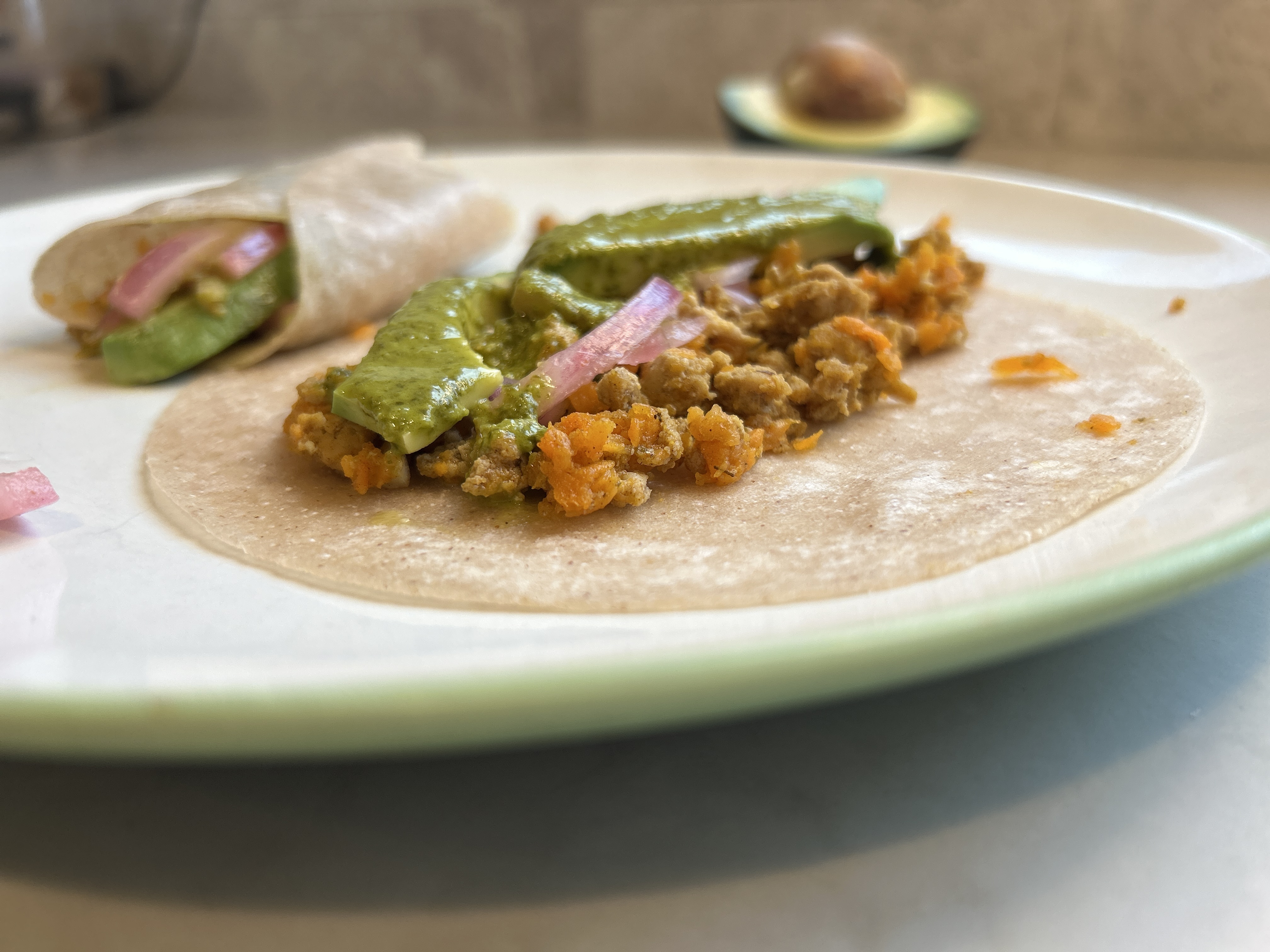 I combine shredded sweet potato with cinnamon-spiced ground turkey, quick-pickled red onions, sliced avocado, and a tangy cilantro-lime drizzle inside Coyotas Cassava Tortillas (my go-to for AIP-friendly wraps). The result is hearty, savory, and satisfying — exactly the kind of balanced breakfast that fuels me for the day ahead.
